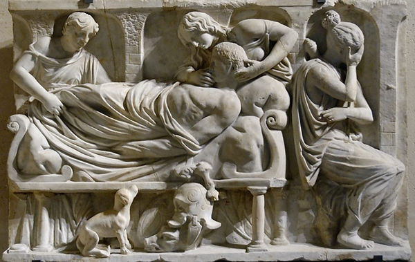 "Los ritos y costumbres funerarios tuvieron una evolución extremadamente progresiva a lo largo de la historia romana. En los tiempos más antiguos no existía un concepto totalmente definido, o claro, de que se podía esperar después de la muerte y los rituales, monumentos fúnebres y obras artísticas relacionadas a la muerte, tenían un sentido visual y de comunicar el status social del muerto que el de una significación religiosa. Luego con el pasar de los años, y los intercambios culturales con otras civilizaciones, se crearon monumentos colosales que vislumbraron al mundo. La sociedad se fue llenando de ritos y costumbres establecidas."
